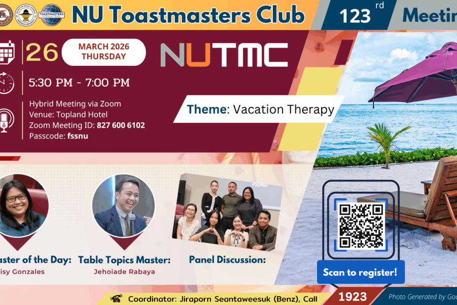 SOCSCI@NU-Thailand is inviting you to Naresuan Toastmasters Club’s 123 rd meetingTheme: “Vacation Therapy”Time: Thursday 26 March 2026, From 5.30 PM to 6.30 PMHybrid Meeting via… Read More »Naresuan Toastmasters Club 123 rd Meeting