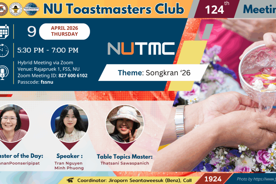 SOCSCI@NU-Thailand is inviting you to Naresuan Toastmasters Club’s 124 th meetingTheme: “Songkran ‘26”Time: thursday 9 April 2026, From 5.30 PM to 6.30 PM Hybrid Meeting… Read More »Naresuan Toastmasters Club 124th Meeting